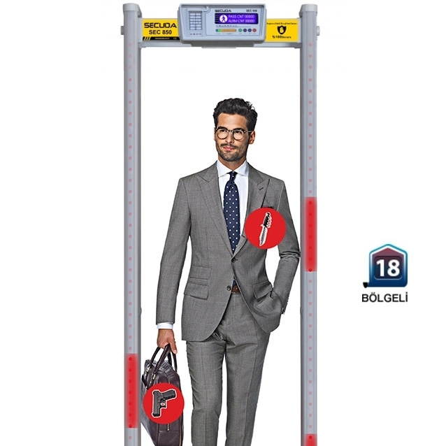 Yüksek duyarlılığa sahip SECUDA SEC 850 kapı tipi metal üst arama dedektörü, tehlikeli metalleri anında tespit ederek sesli ve ışıklı olarak ikaz verir. 18 tarama bölgesine sahip olup metalin geçen kişinin neresinde olduğunu net bir şekilde gösterir. LCD ekranı ile tüm güvenlik ve hassasiyet seviyeleri rahatlıkla girilebilir ve giriş ekranınada şifre konabilir. Alışveriş merkezleri, oteller, hastaneler, belediyeler, kongre ve fuar alanları, askeri ve emniyet binaları, plaza ve işyerlerinde 7/24 sorunsuz olarak kullanılabilir. Kurulumundan sonra ilave bakım gerektirmeyen metal kapı dedektörüne metal nesnelerin ağırlığı, hacmi, boyutu, konumu önceden ayarlanabilir ve anahtar, mücevher, kemer tokası vb. yanlış alarmlar hariç tutulabilir.